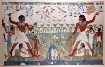 밀은 부유한 고대 이집트인과 가난한 고대 이집트인 모두가 먹는 주요 고대 이집트 음식 중 하나였던 빵으로 만들어졌다. 사진(오른쪽)은 빵을 만드는 과정을 보여준다.