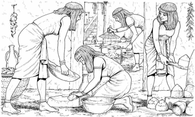 먼저 곡식을 밀가루로 만들었다. 그리고 나서 그것은 물과 이스트를 넣어 반죽으로 만들어졌고, 그것은 돌 오븐에 요리되기 전에 점토 틀에 넣어졌다.